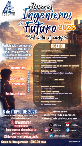 El Foro Jóvenes Ingenieros del Futuro 2026 es una iniciativa del Colegio de Ingenieros Petroleros de México dirigida a estudiantes y recién egresados de Ingeniería Petrolera, que busca fortalecer la vinculación entre la formación académica y el sector energético a través de un encuentro el 8 de mayo de 2026 en Ciudad de México.
